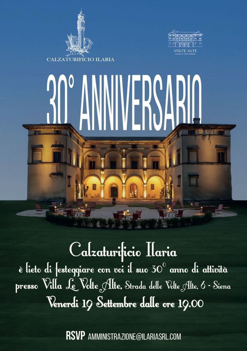 Nel settembre 2025 abbiamo celebrato con orgoglio i 30 anni di attività come Calzaturificio Ilaria, con un evento speciale tenutosi presso Villa Le Volte Alte, alle porte di Siena.